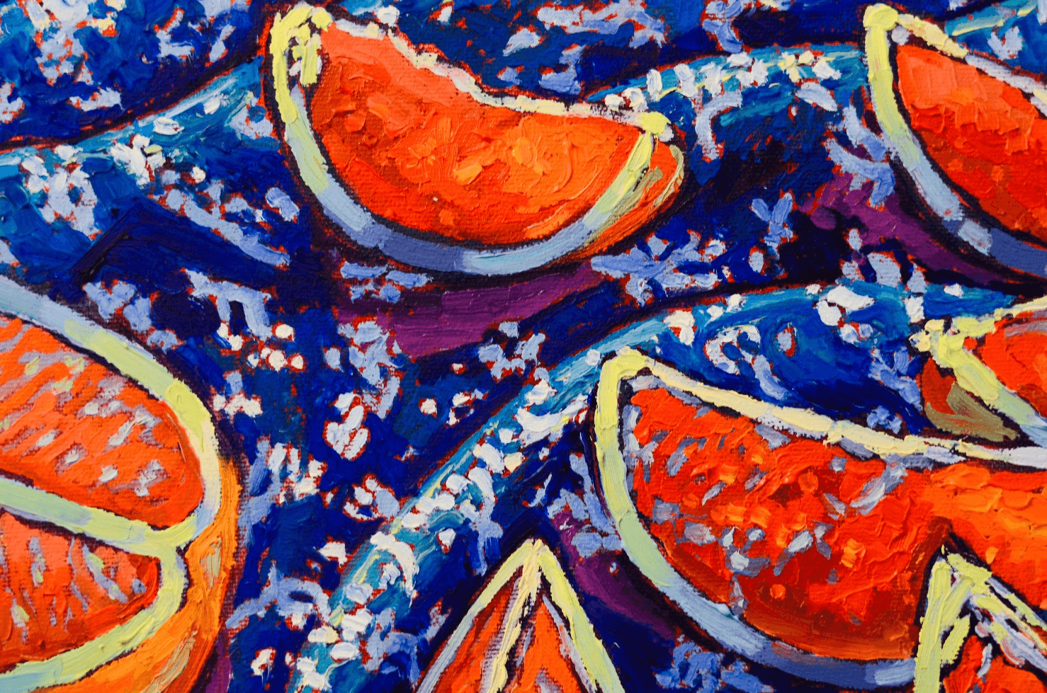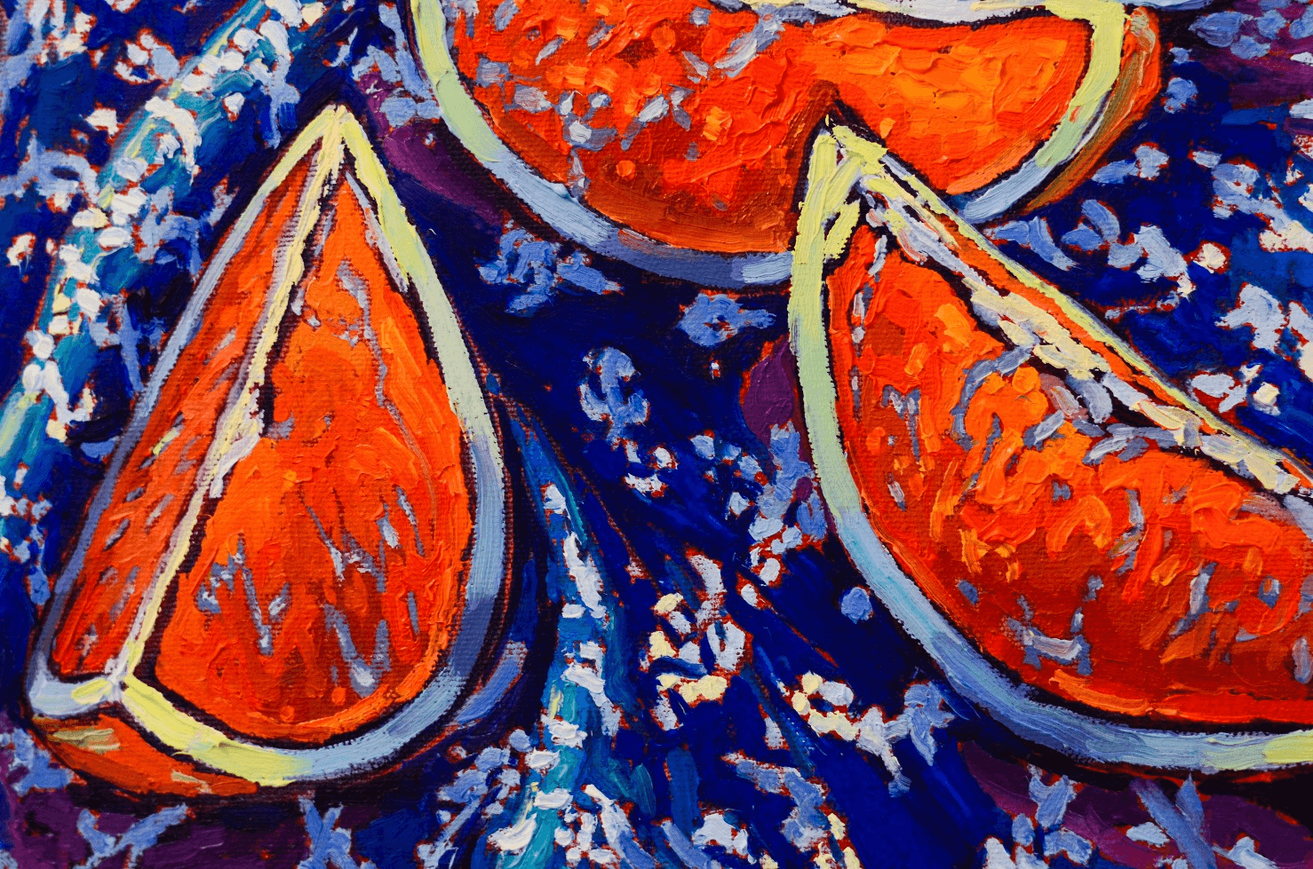 Vibrant and fresh looking orange slices set against a contrasting, fluid and rich blue background. The thick brushstrokes and paint add a beautiful th...